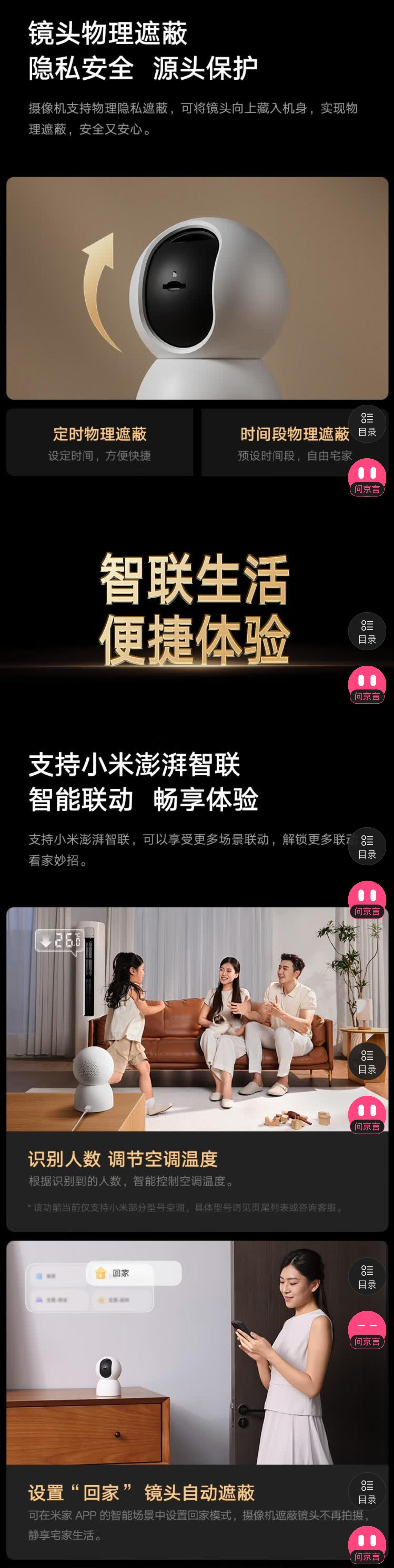 最近有了老二要从月子中心回家了,准备前两个月请个住家的保姆。于是又想把放柜子里吃灰(主要是 24 小时对着家里,怕隐私问题)的小米摄像头装回去,但还是心有不惬。闲来无事顺道去小米商城逛了逛最新的摄像头,看了看最新的 4 代系列好像都标配了可以智能联动控制的物理遮挡板。