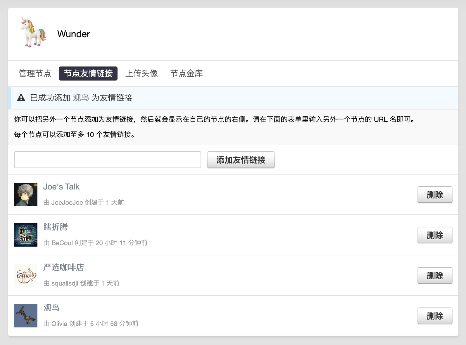 现在当你在管理自己的节点时,可以将其他节点添加为友情链接。然后友情链接节点就会显示在你的节点页面的右侧。